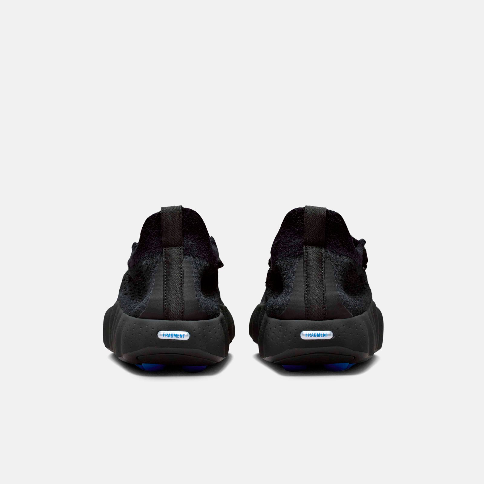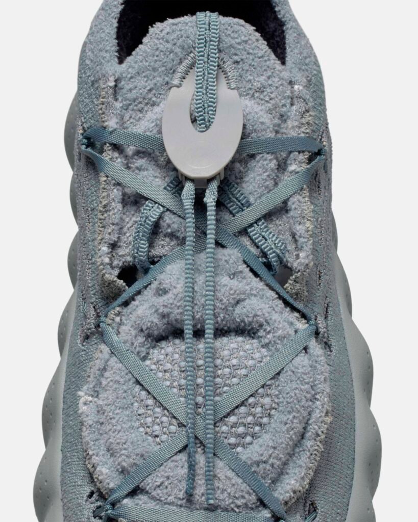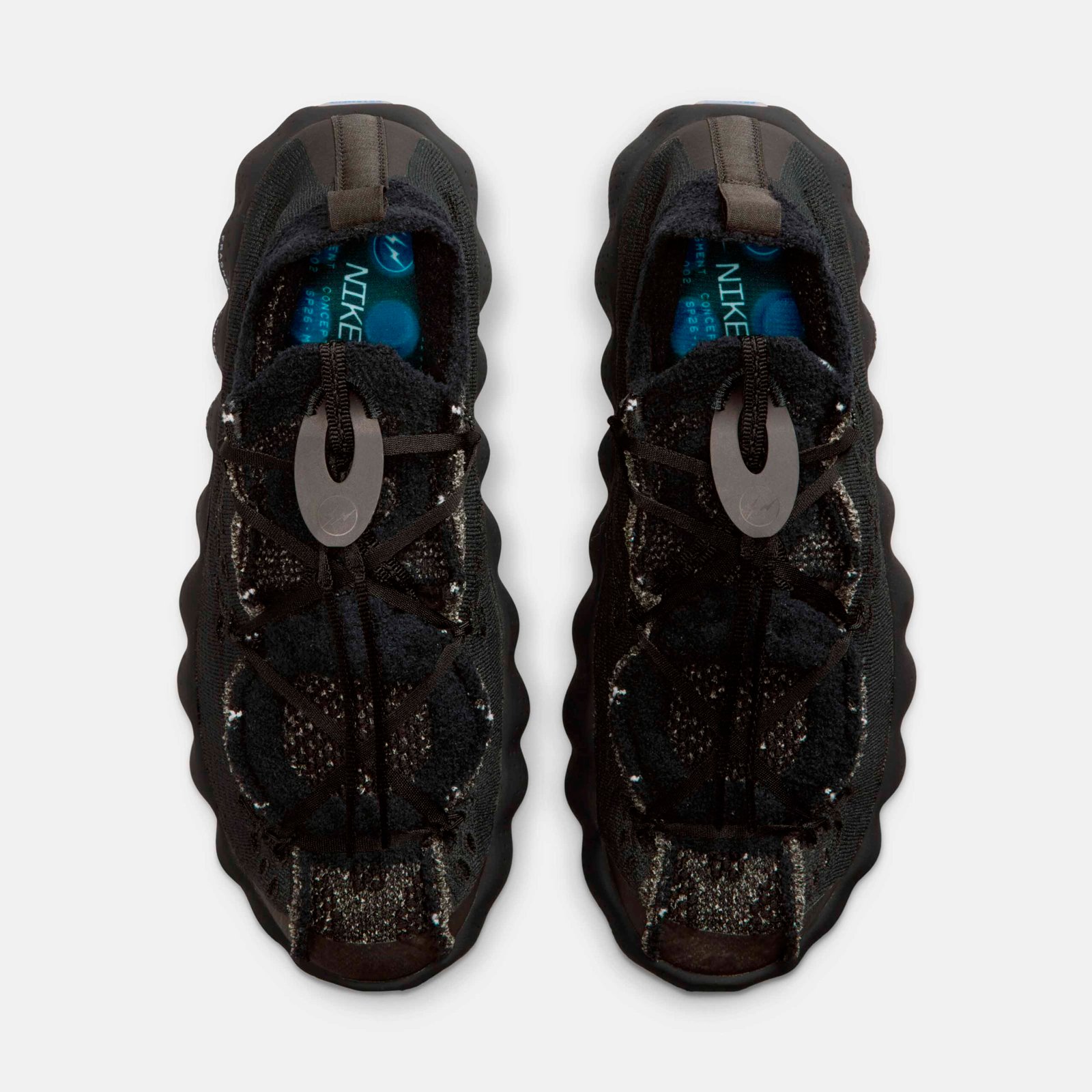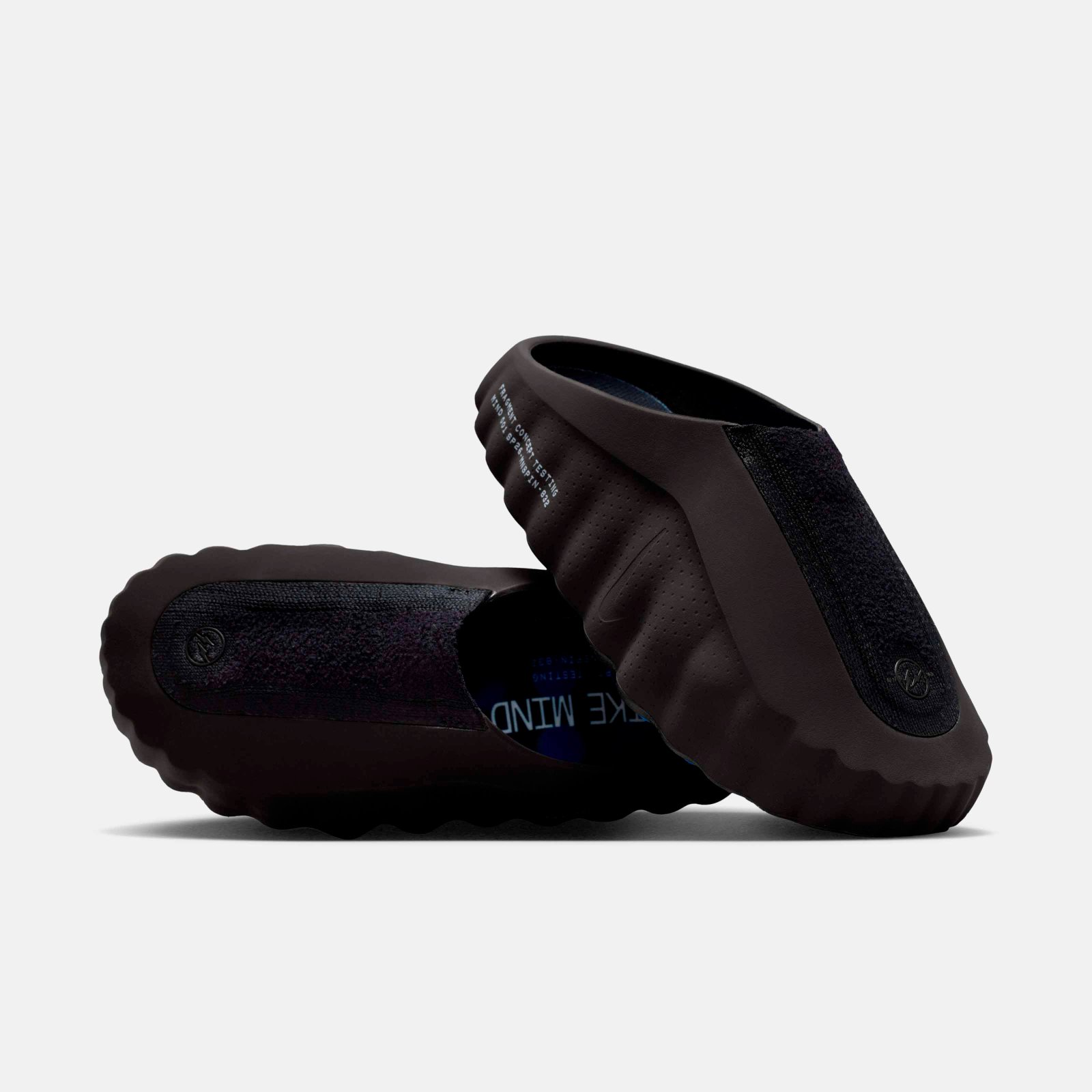 O destaque técnico recai sobre a linha Nike Mind, baseada em neurociência para promover relaxamento através de estímulos sensoriais. O modelo Mind 002 recebeu a transformação mais radical desta collab, substituindo a construção original por um cabedal integral em Flyknit. A estrutura utiliza 22 sensores de espuma independentes que mapeiam pontos de pressão anatômicos, todos tingidos no icônico azul da fragment design.