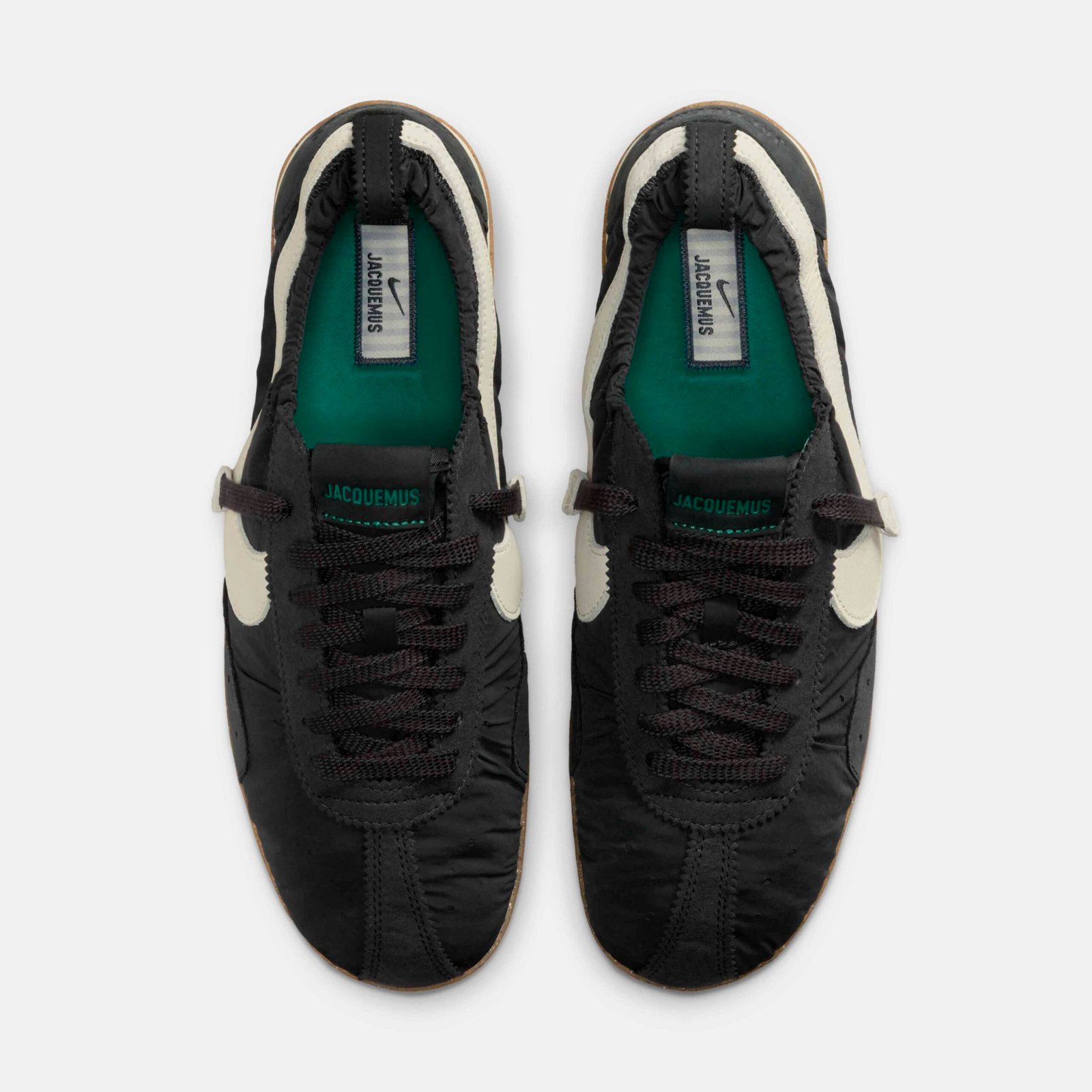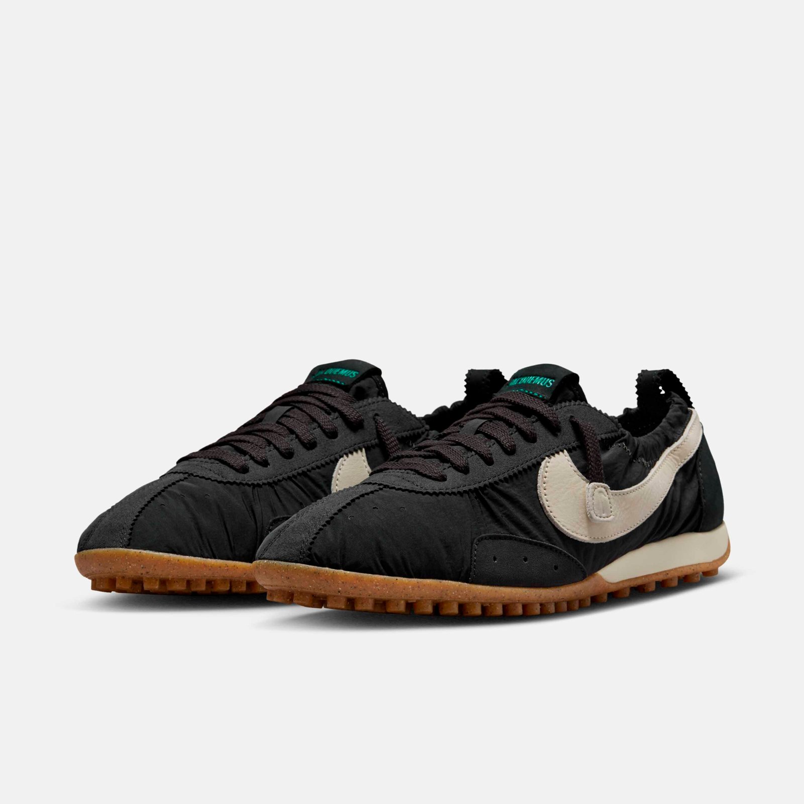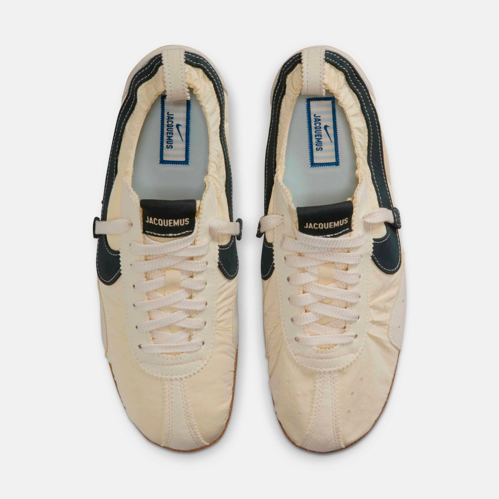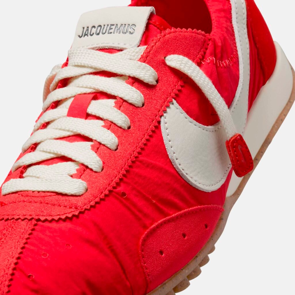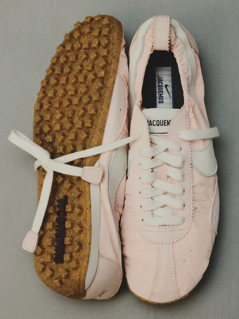 A construção atual reflete a filosofia de design parisiense da Jacquemus, fundindo a origem de performance do modelo com uma estética de ballet moderno. O cabedal em nylon franzido e o solado de borracha Nike Grind criam uma silhueta de perfil baixo, descrita como um torpedo shoe contemporâneo. Sobre a escolha do rosa pálido, o criativo destaca a intenção por trás da cor: “A escolha do pale pink está enraizada no DNA da Jacquemus como uma cor sensual e ingênua que traz suavidade e intimidade à silhueta, remodelando o ícone através das nossas próprias lentes”.