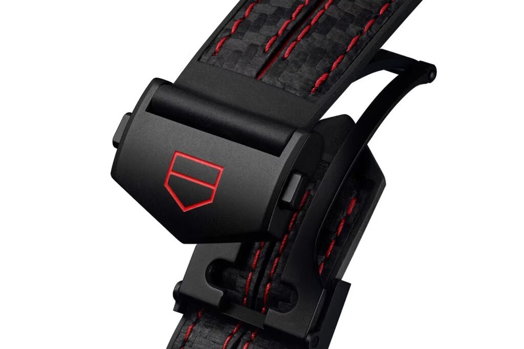 O relógio é construído sobre uma robusta caixa de 45mm em titanium grade-2, com acabamento em black DLC — material escolhido pela sua extrema leveza e resistência, espelhando os componentes de alta performance dos carros da categoria.