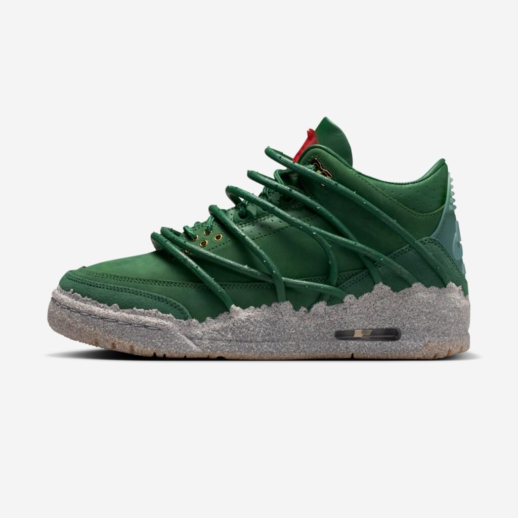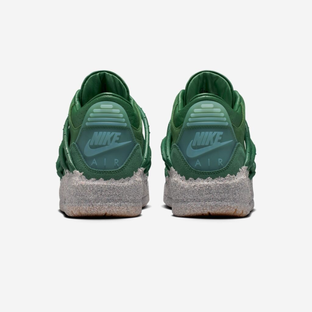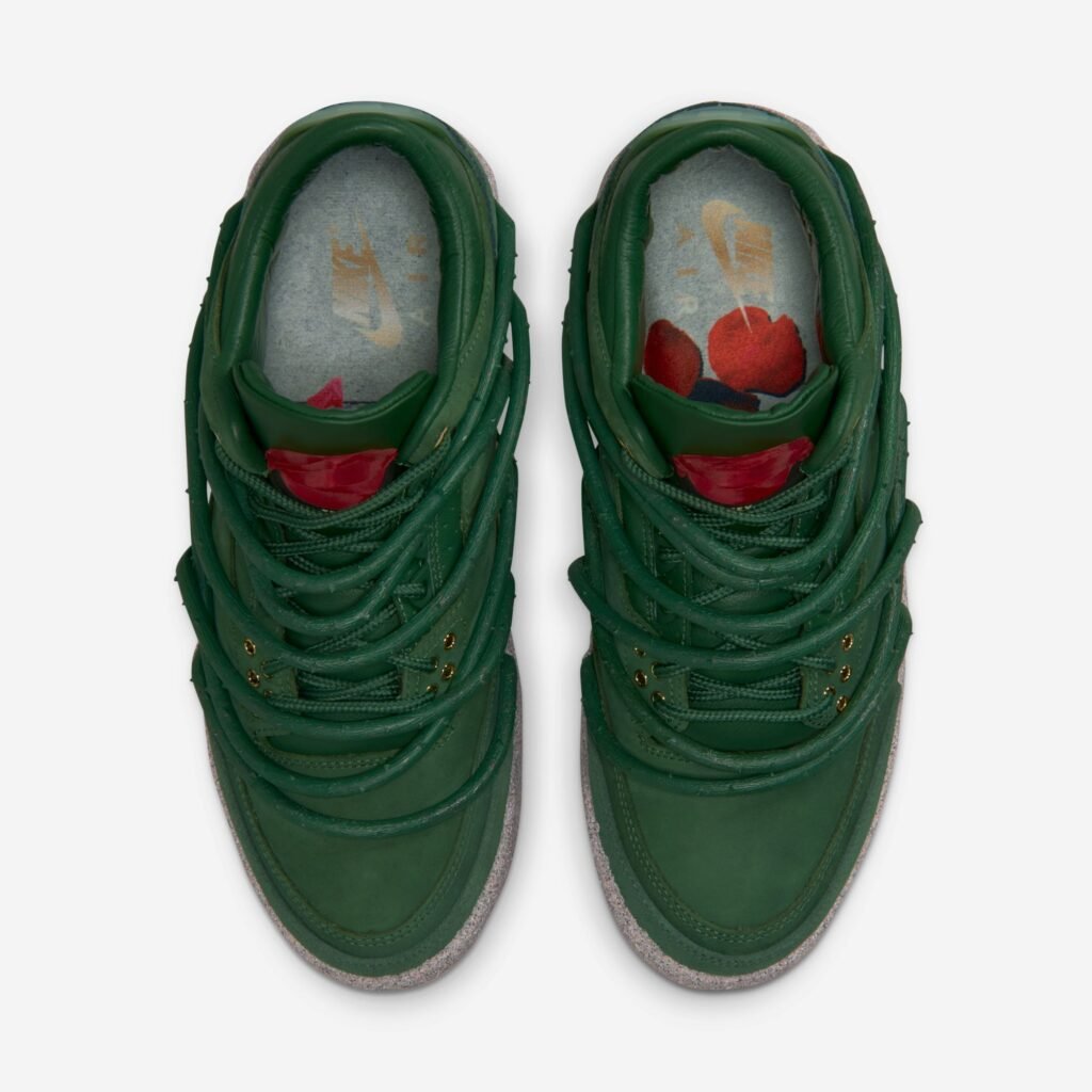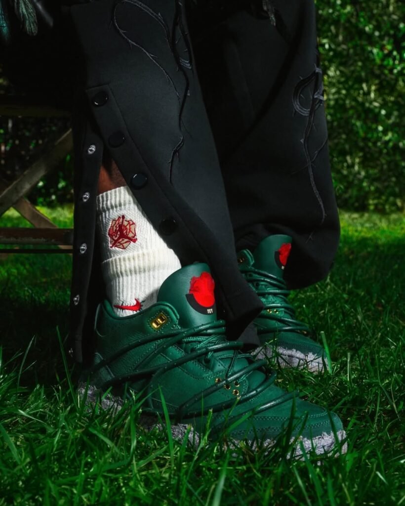 A construção do Air Jordan 3 é marcada por um cabedal de couro premium em tom Fir e uma entressola que mimetiza a aspereza do ambiente urbano. Detalhes em ouro metálico e o clássico branding Nike Air no calcanhar equilibram a herança da linha Jordan com a visão autoral de Teyana Taylor. No interior, frases manuscritas e gráficos de pétalas de rosa garantem uma camada de exclusividade voltada para a experiência do usuário.
