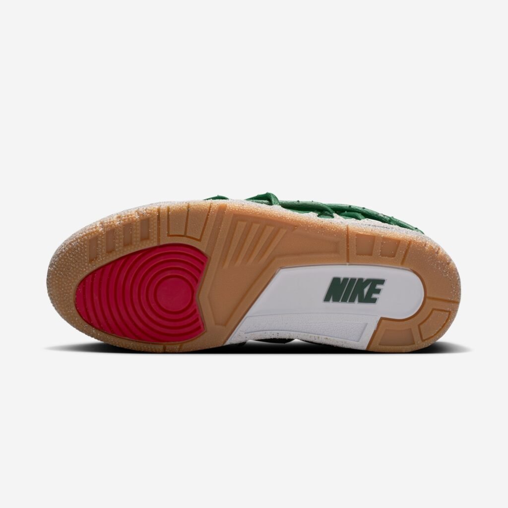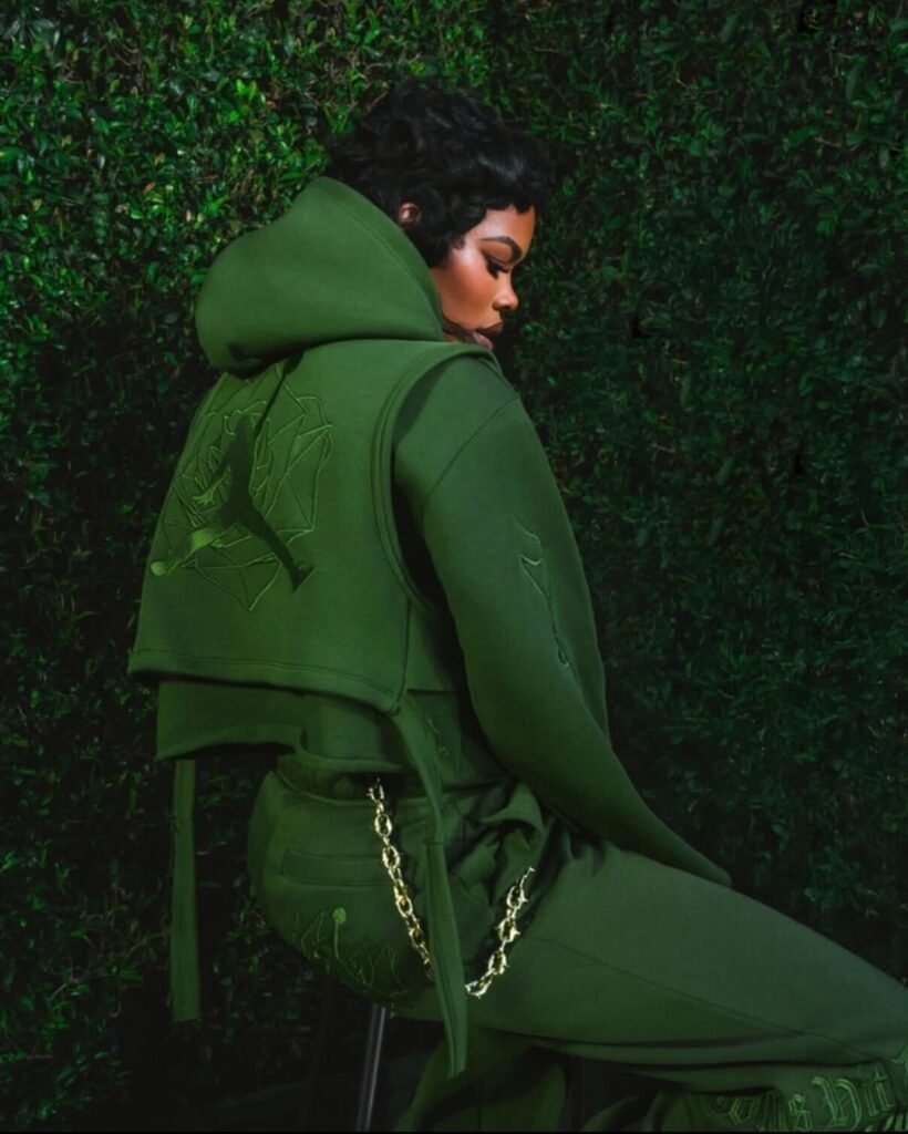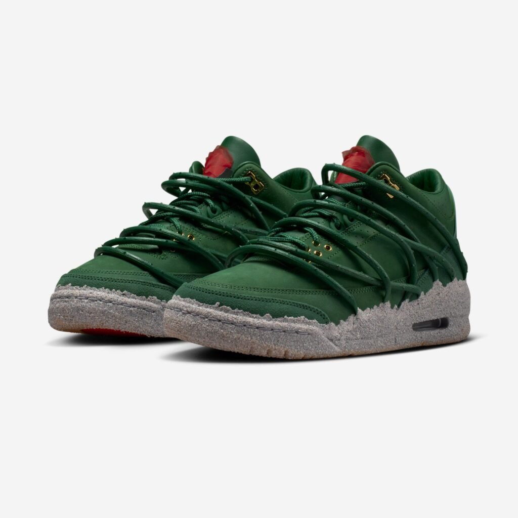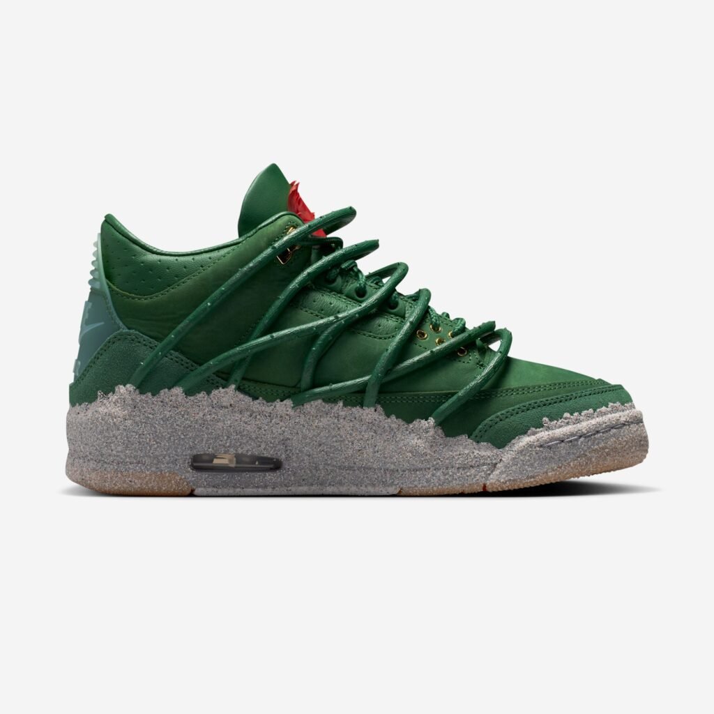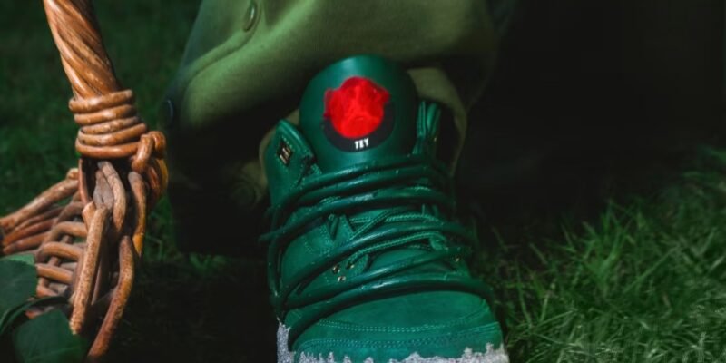 A construção do Air Jordan 3 é marcada por um cabedal de couro premium em tom Fir e uma entressola que mimetiza a aspereza do ambiente urbano. Detalhes em ouro metálico e o clássico branding Nike Air no calcanhar equilibram a herança da linha Jordan com a visão autoral de Teyana Taylor. No interior, frases manuscritas e gráficos de pétalas de rosa garantem uma camada de exclusividade voltada para a experiência do usuário.