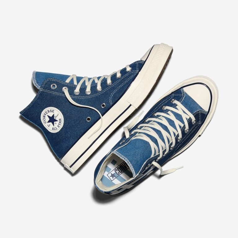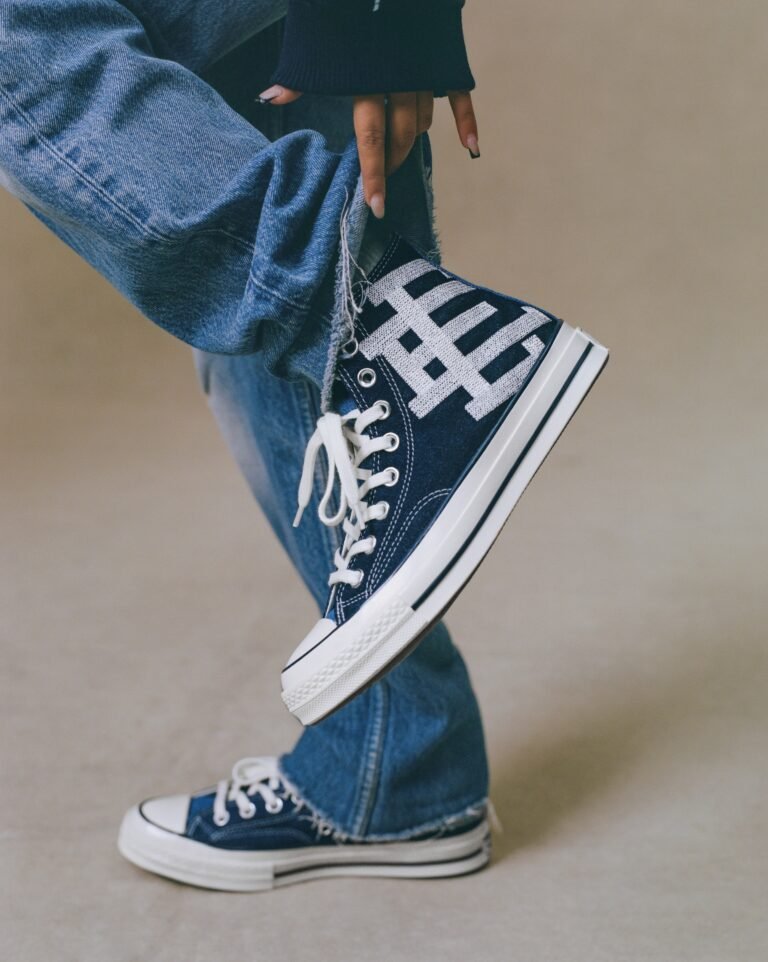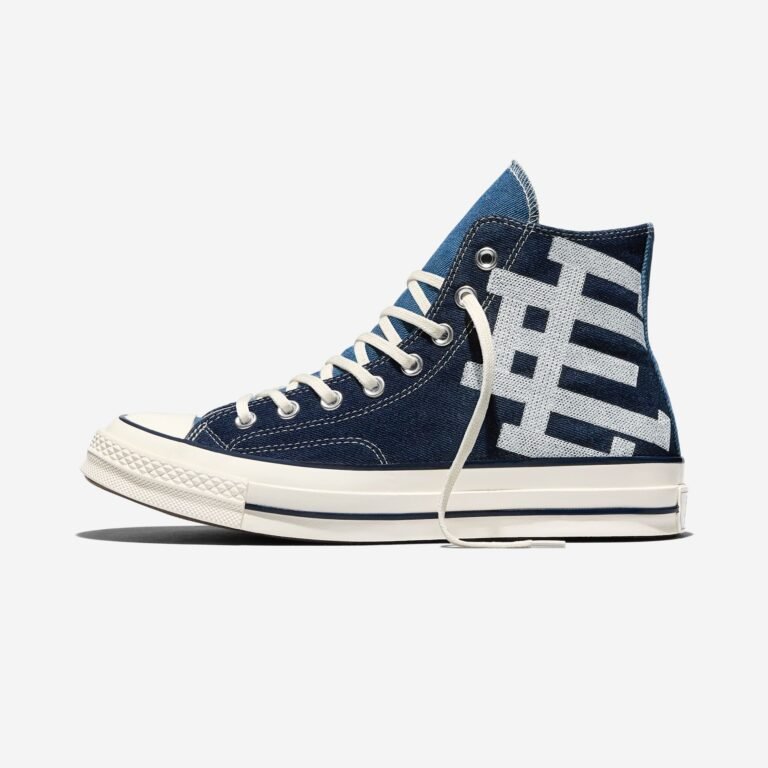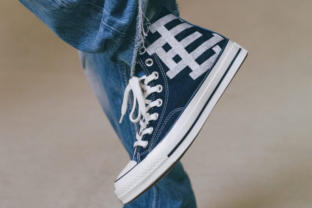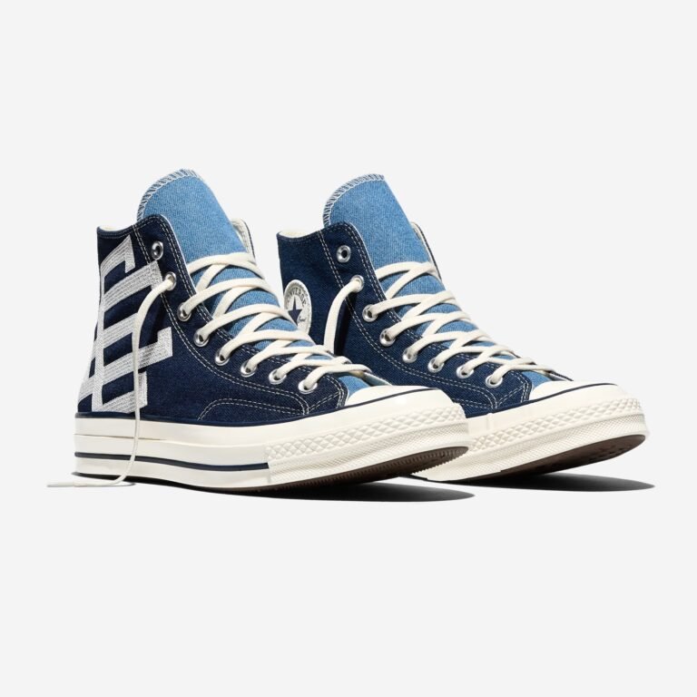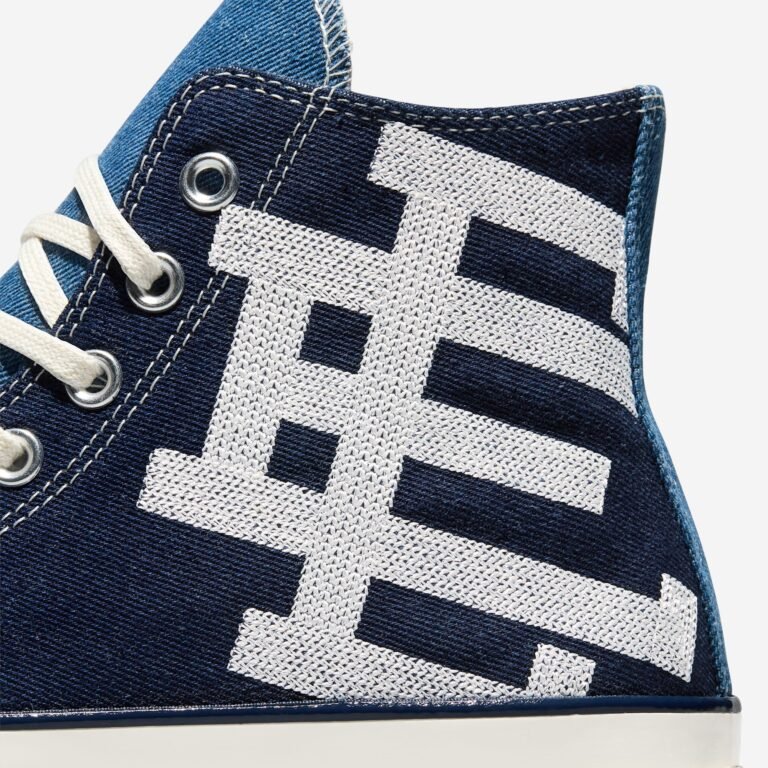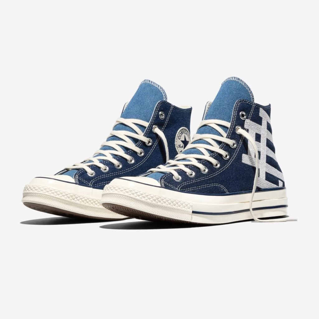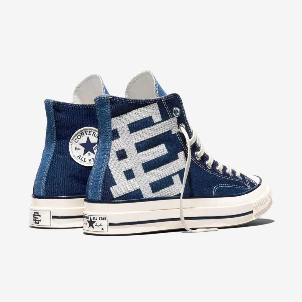 O Chuck 70 recebe uma construção em denim azul escuro, contrastada por lavagens mais claras na lateral medial, calcanhar e língua. O logo “EE” surge tecido na lateral externa, enquanto as etiquetas de língua e placas de calcanhar recebem a assinatura da colaboração. A abordagem preserva a estrutura original, mas imprime a autoridade estética de Emanuel em cada detalhe técnico.
