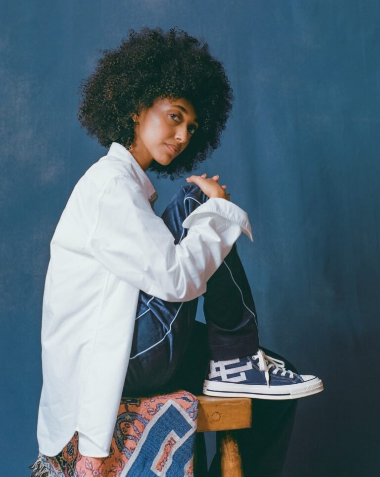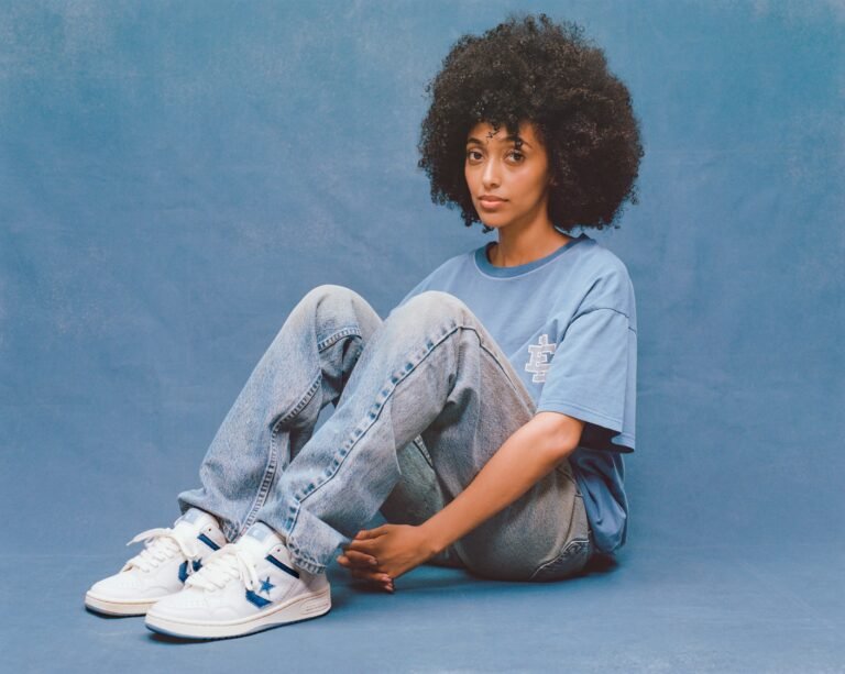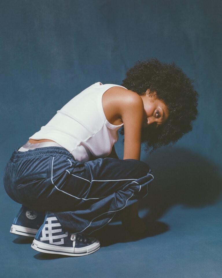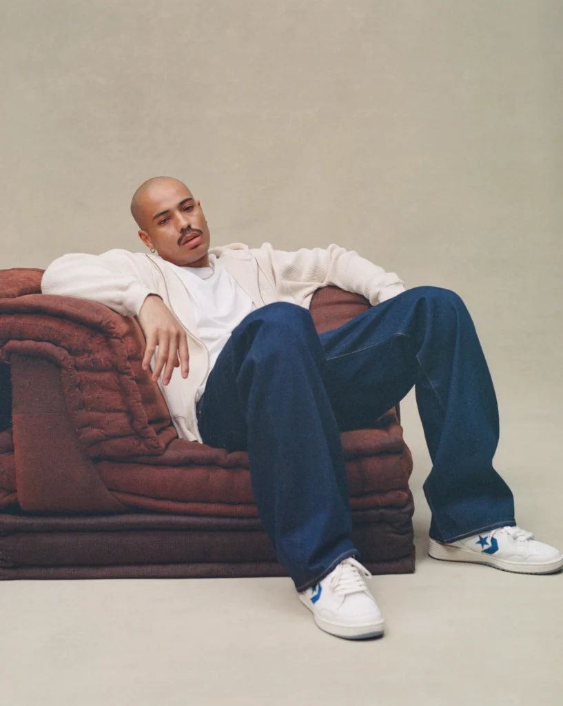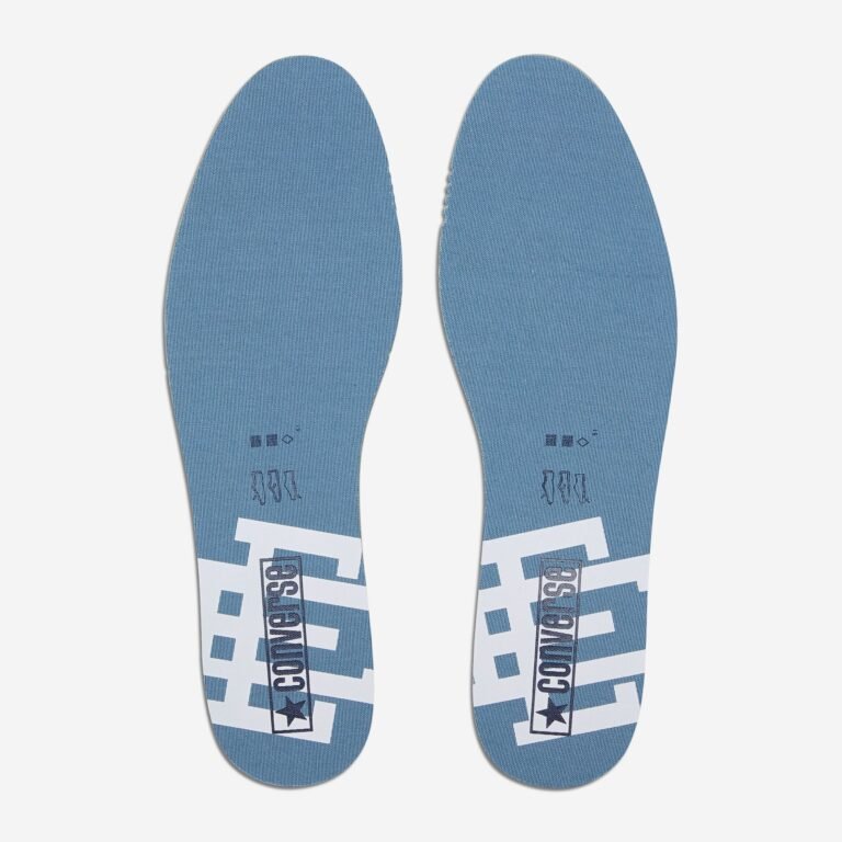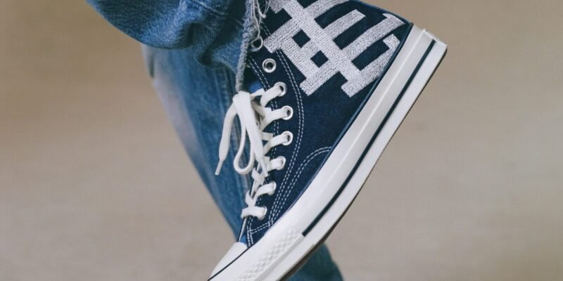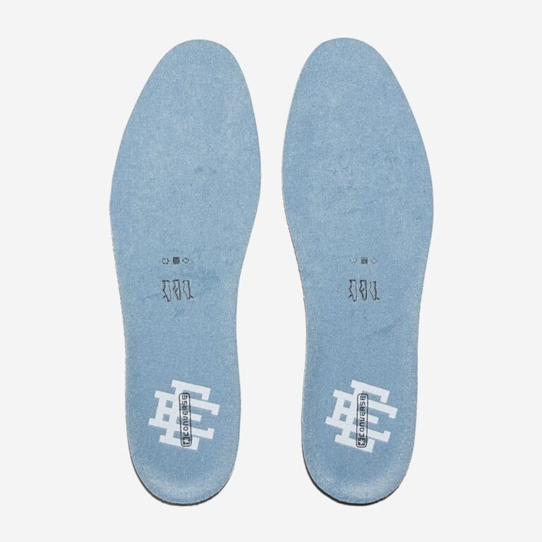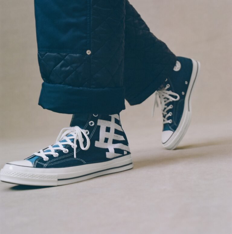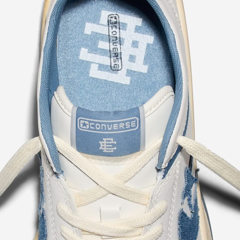 O Chuck 70 recebe uma construção em denim azul escuro, contrastada por lavagens mais claras na lateral medial, calcanhar e língua. O logo “EE” surge tecido na lateral externa, enquanto as etiquetas de língua e placas de calcanhar recebem a assinatura da colaboração. A abordagem preserva a estrutura original, mas imprime a autoridade estética de Emanuel em cada detalhe técnico.