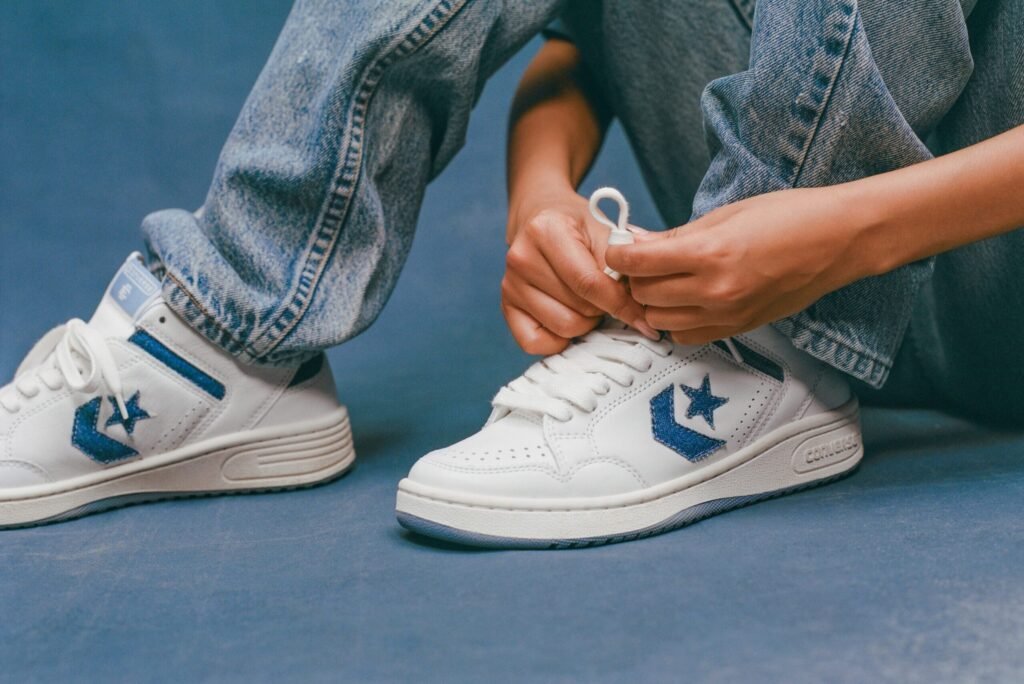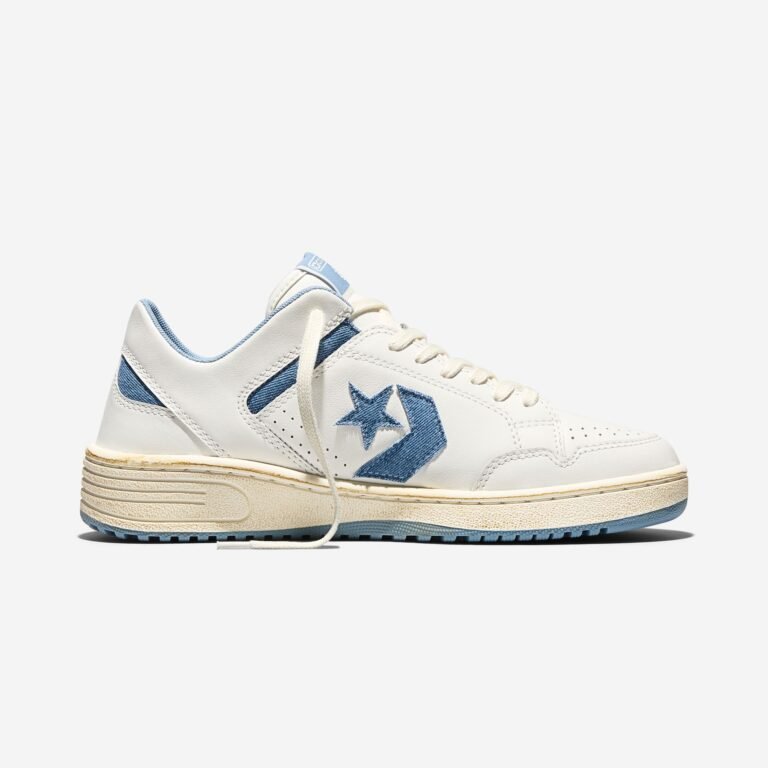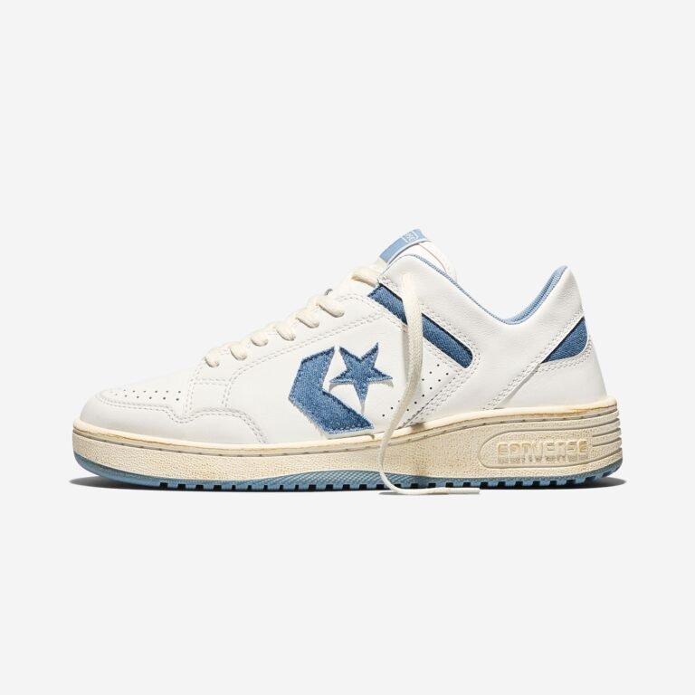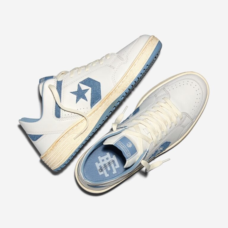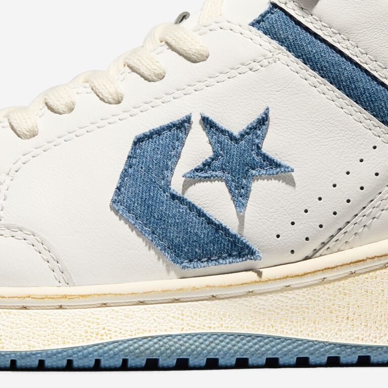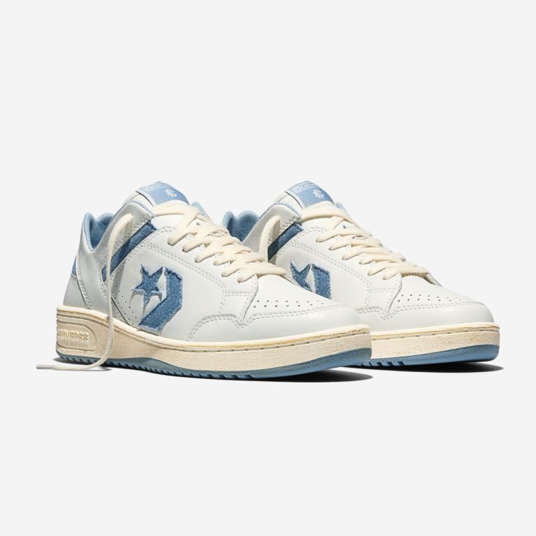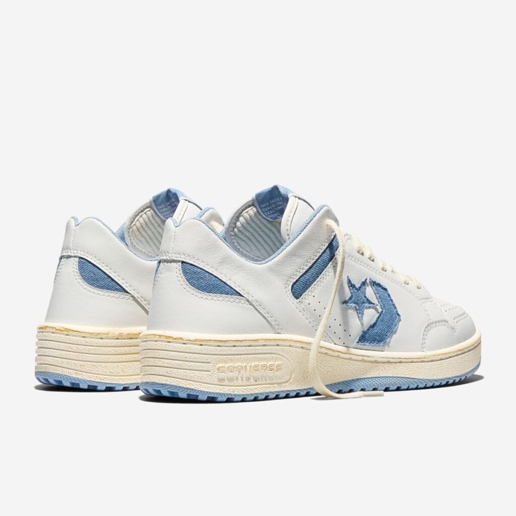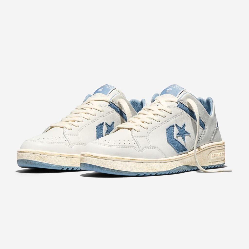O Weapon Ox, resgatado do arquivo de basquete da Converse, é reconstruído com cabedal de couro branco e uma entressola com acabamento envelhecido para um visual vintage. O logo Star Chevron e os detalhes de tornozelo apresentam acentos em denim, finalizados por um solado azul claro. A collab teve seu primeiro capítulo em 2025 e agora consolida o diálogo entre o esporte e a rua.
