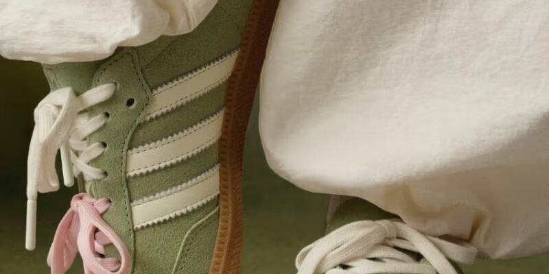 Já o icônico Samba, favorito absoluto do estilo terrace, foi renovado com um cabedal em verde-matcha e listras laterais em off-white. A silhueta é ancorada pela tradicional sola de goma, mas recebe o “spin” característico da colaboração através de cadarços duplos em branco e rosa suave, equilibrando o peso histórico do tênis com uma leveza contemporânea.