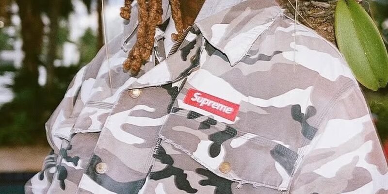 A narrativa visual da coleção parece flertar diretamente com a “cultura bootleg“, utilizando um branding sensacionalista e elementos de design intencionalmente inconsistentes. O conjunto desfilado por Offset apresenta uma estética militarista, composto por uma camisa utilitária e calças cargo combinando, ambas cobertas por uma estampa camuflada em tons de cinza. O detalhe principal reside no icônico Box Logo vermelho da Supreme, posicionado de forma clássica no lado esquerdo do peito.