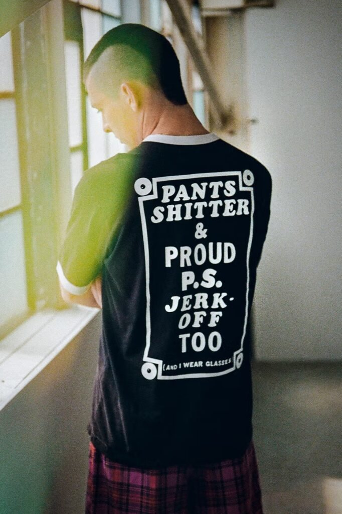 O segmento de vestuário é sustentado por itens essenciais de alto conforto, como moletons com capuz e zíper e calças de moletom combinando. A oferta de camisetas é robusta, incluindo versões clássicas, Banner Tees, Ringer Tees e camisas de tecido plano, todas servindo como suporte direto para as gráficas provocativas de Kelley. Para camadas versáteis, a linha incorpora também uma malha térmica clássica, garantindo que o repertório visual do artista permeie todas as camadas do guarda-roupa de transição climática.