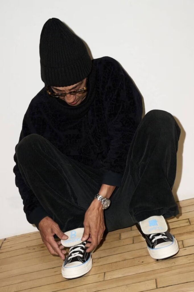 O movimento subverte a construção clássica do Chuck 70, substituindo a tradicional lona por um cabedal premium de couro de avestruz falso (faux ostrich) na cor preta. A escolha do material introduz uma profundidade tátil e uma sofisticação de luxo utilitário à silhueta, enquanto o icônico “B” bordado na lateral e a tipografia “Brooklyn” na língua ancoram o design nas raízes da equipe.